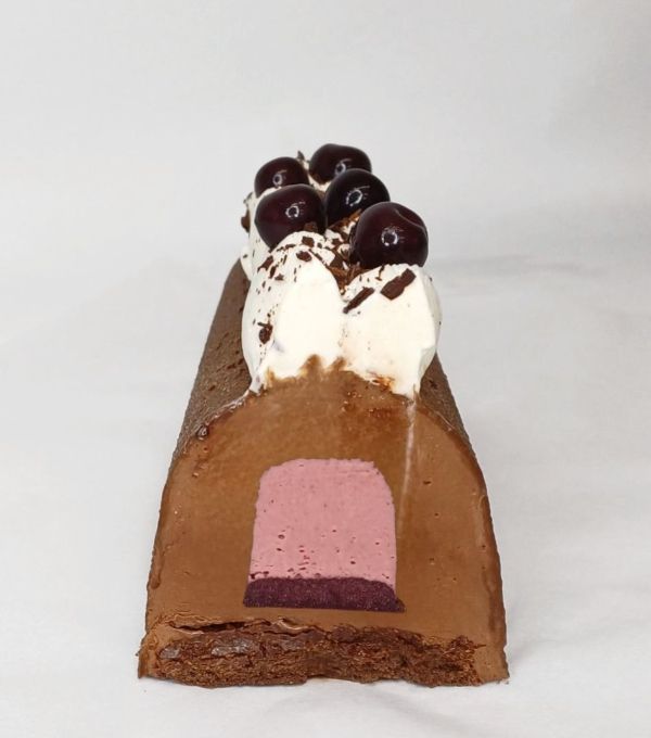 Ici la mousse au chocolat noir et la chantilly au kirsch accueillent un cœur crémeux et une gelée à la cerise.