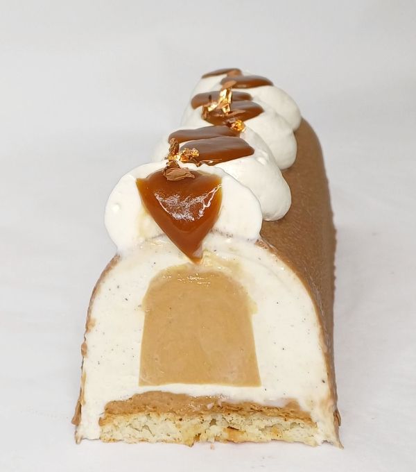 La douceur d'une mousse à la vanille de Tahiti , associée à un cœur crémeux au caramel beurre salé, le tout déposé sur un biscuit croustillant au spéculoos.