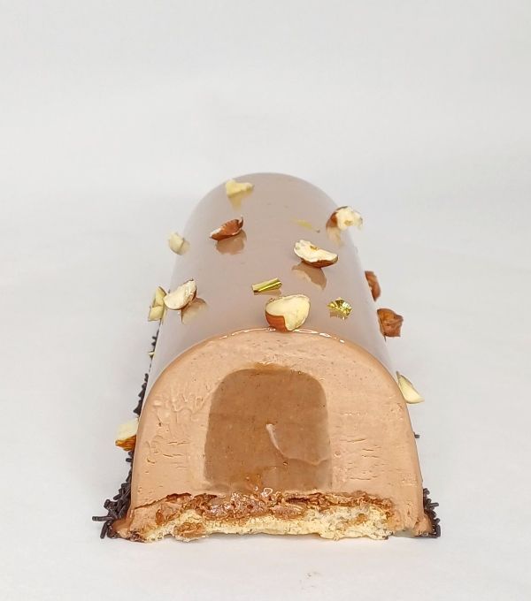 Le tout déposé sur un biscuit croustillant à la noisette et au praliné.