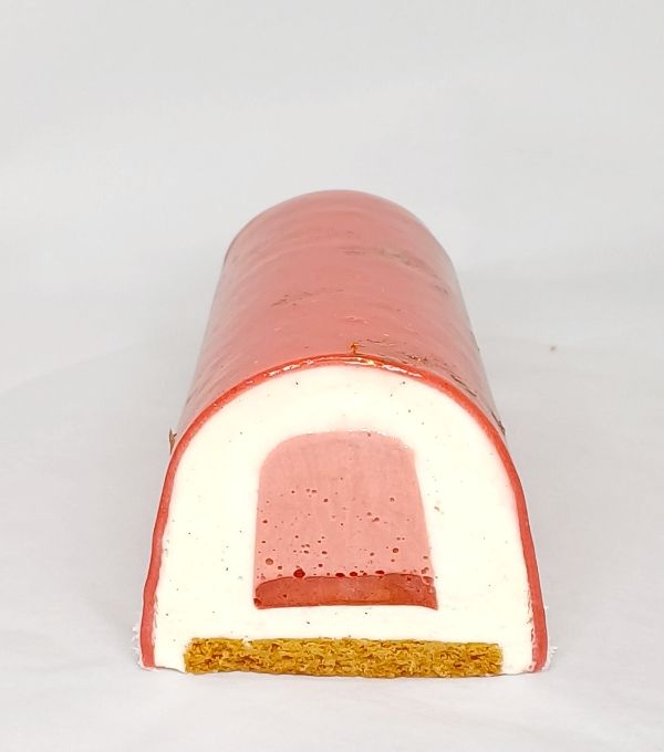 Une buche savoureuse où la mousse à la vanille de Madagascar rencontre un cœur crémeux à la fraise.